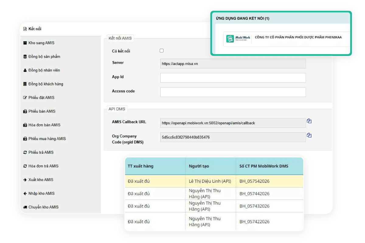 MobiWork DMS hiện nay cung cấp khả năng kết nối chuyên sâu với phần mềm kế toán MISA AMIS, tạo ra một luồng dữ liệu khép kín và tự động hóa: