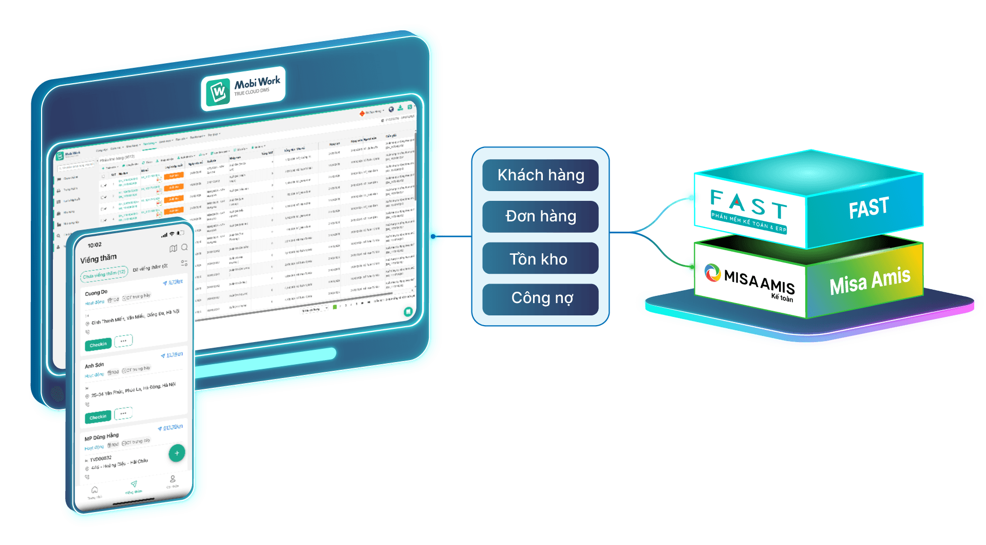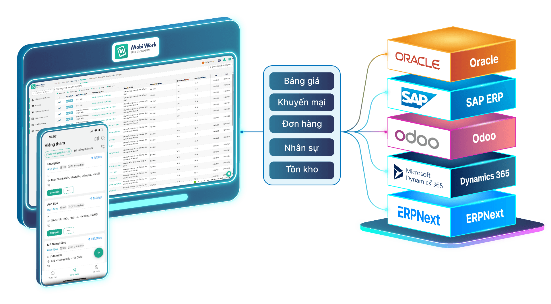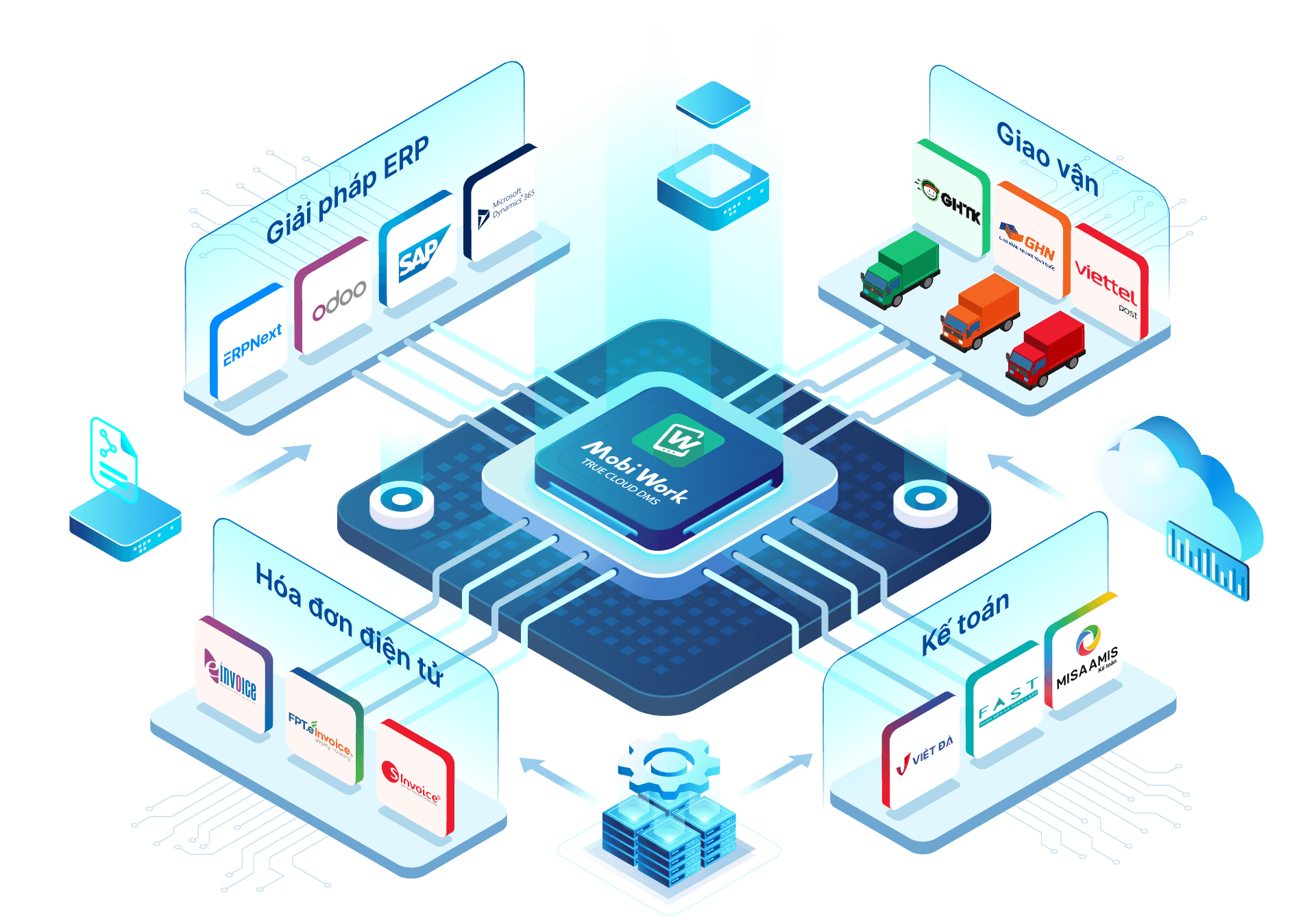 MobiWork DMS được thiết kế như một "mảnh ghép" hoàn hảo, dễ dàng kết nối với các hệ thống phần mềm hiện tại của doanh nghiệp để tạo ra một luồng dữ liệu xuyên suốt, không gián đoạn.