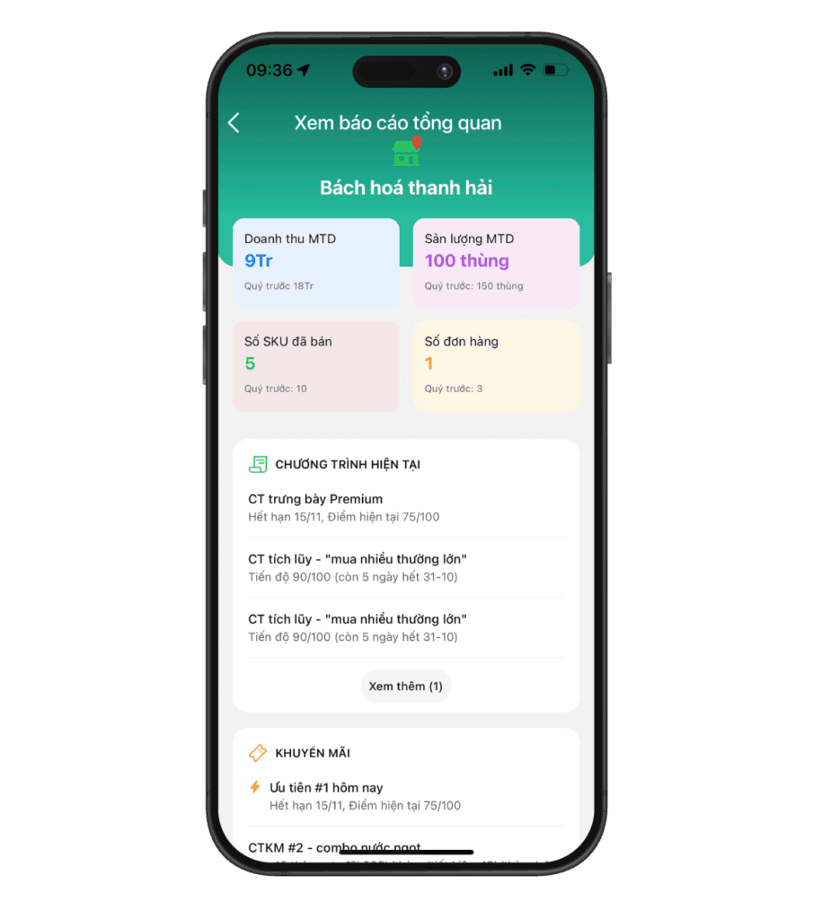 - Quản lý POSM, chương trình khuyến mãi, trưng bày và tích lũy thưởng.